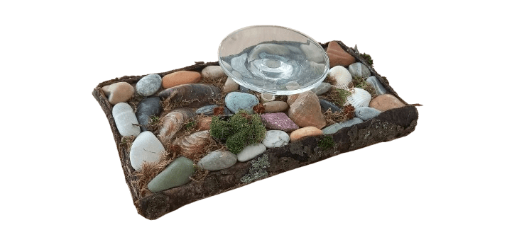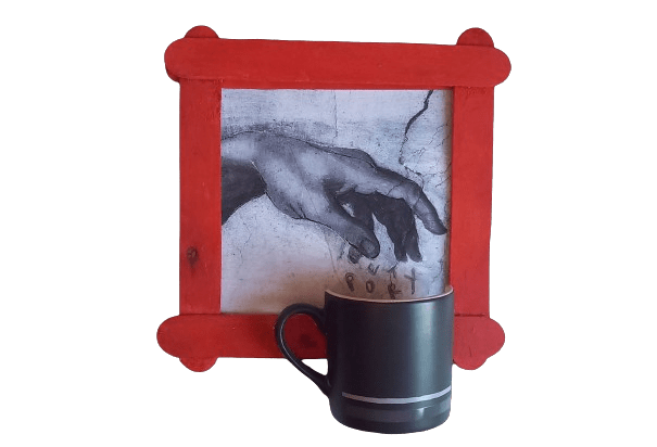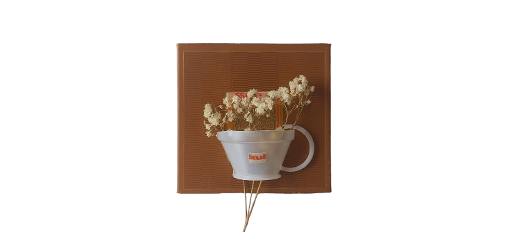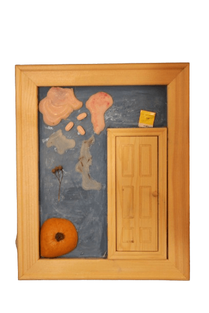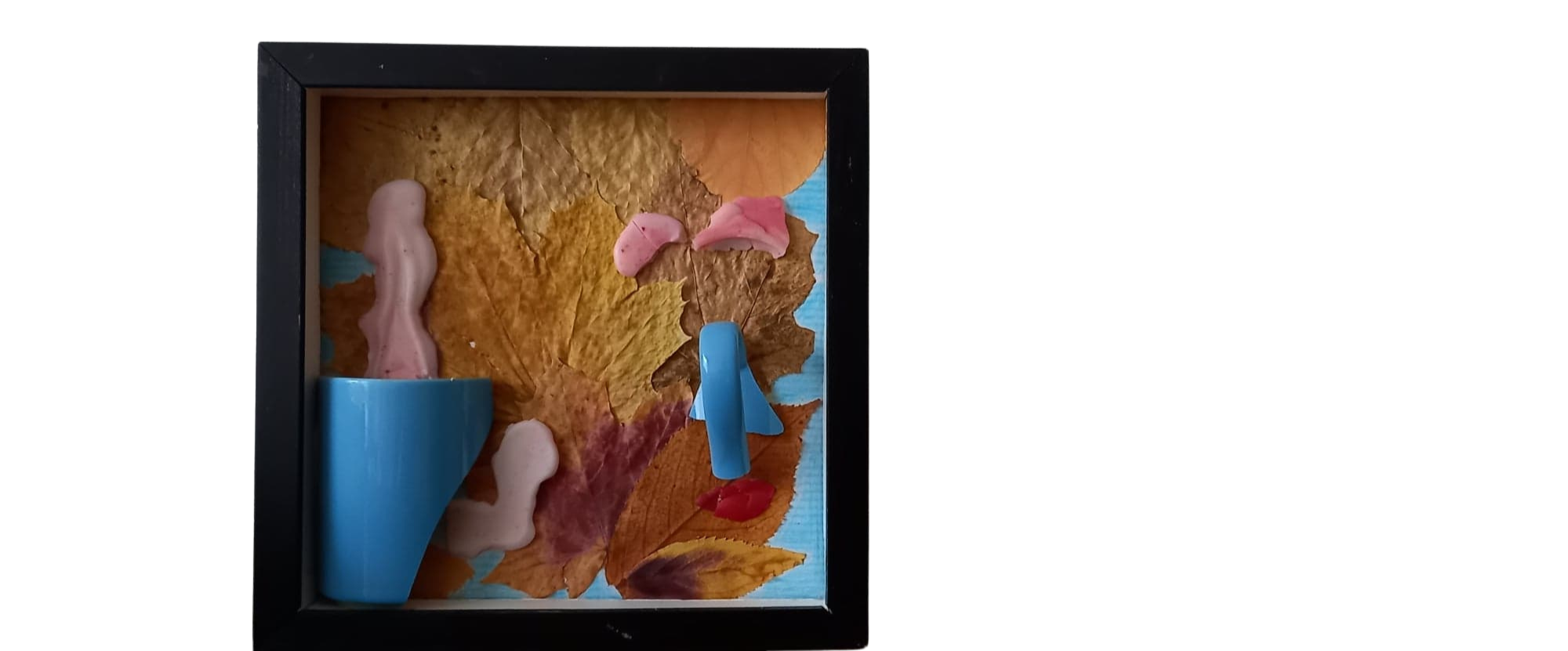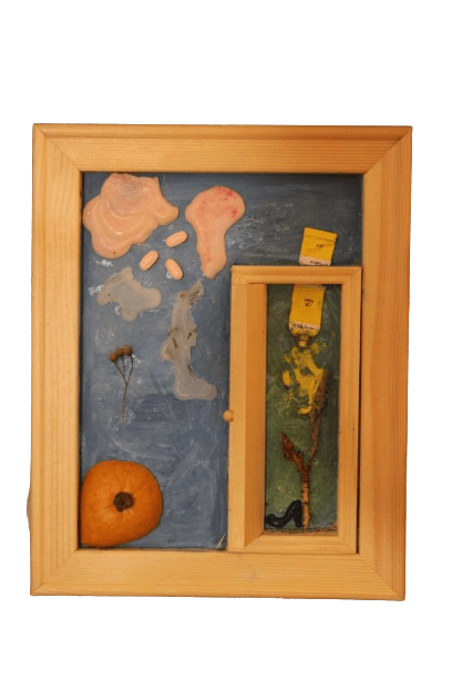 Broken mugs, glasses or frames, pieces of wood, postcards and magazine stripes, leaves, dried flowers, pumpkin dried skin, pills, wax, stones…